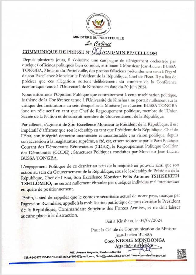 Le ministère du Portefeuille de la République Démocratique du Congo a vivement réagi face à une campagne de dénigrement visant Monsieur Jean Lucien Bussa. Selon le ministère, une officine politique bien connue tente d’attribuer à M. Bussa des propos fallacieux prétendument tenus à l’égard du président Félix Tshisekedi.