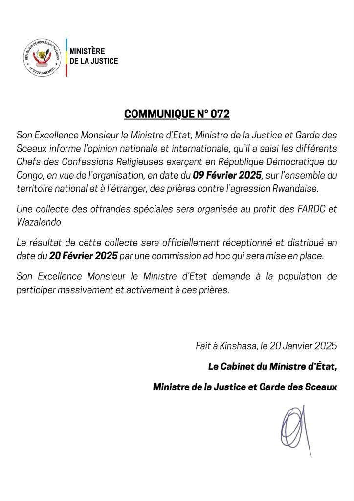 Dans un communiqué rendu public ce jour, le ministre de la Justice et Garde des Sceaux, Constant Mutamba, a informé l’opinion tant nationale qu’internationale de l’organisation d’une journée de prières à l’échelle nationale et à l’étranger, prévue pour le 9 février 2025. Cette initiative vise à mobiliser les forces spirituelles contre ce qu’il qualifie d' »agression rwandaise » en République Démocratique du Congo (RDC).