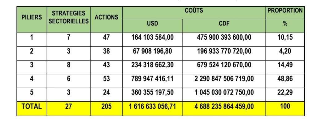 Ce programme ambitieux nécessite un financement estimé à 4 688 235 864 459 CDF (Francs congolais) ou 1 616 633 056,71 USD (dollars américains) au taux de change de 2 900 au 5 juillet 2024.