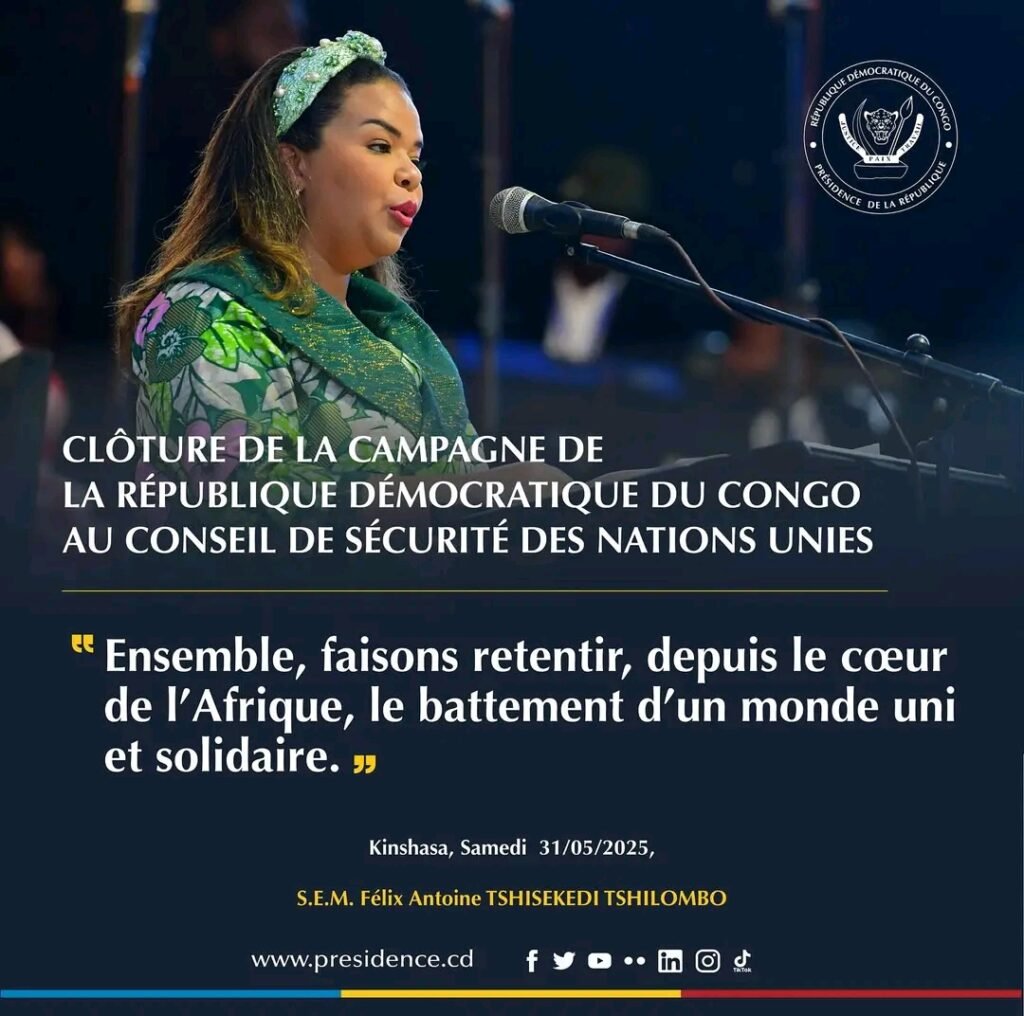 Le Président de la République Félix Tshisekedi a présidé samedi 31 mai à Kinshasa, la cérémonie de clôture dela campagne pour la candidature de la République Démocratique du Congo (RDC) en tant que membre non permanent du Conseil de sécurité des Nations-Unies, pour l’exercice 2026-2027.